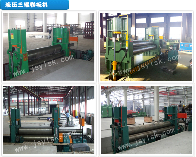 該機結(jié)構(gòu)型式為三輥對稱式,上輥在兩下輥中央對稱位置作垂直升降運動,通過液壓缸內(nèi)的液壓油作用于活塞而獲得,為液壓傳動,兩下輥作旋轉(zhuǎn)運動,通過減速機的輸出齒輪與下輥齒輪嚙合,為卷制板材提供扭矩。